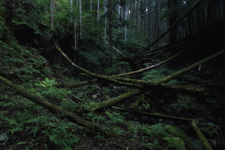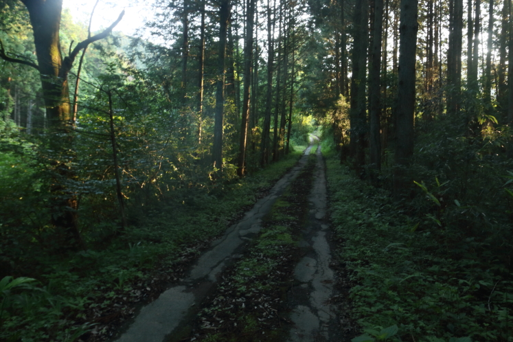 集落を抜けて山に向かって歩いていくと、すぐに道は荒れた林道になった。