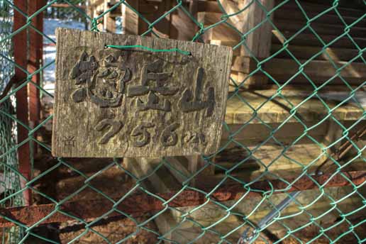 神社を囲む金網には、手作りの山名表示板が。