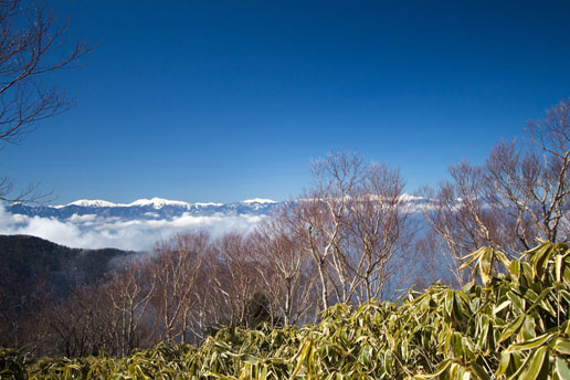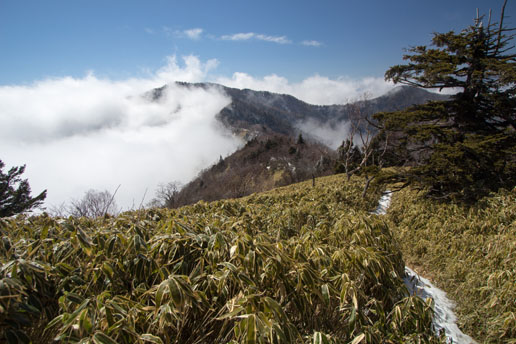 稜線上の雪は緩んでいて、踏み抜くと股までズボッといきます。数歩進むとズボッ。泣きそうになりながら這い上がります。