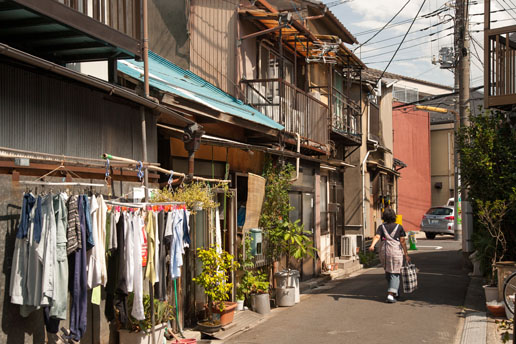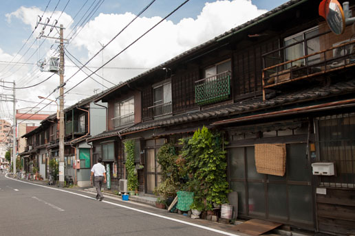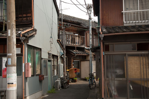 細い路地の両側に木造二階建ての町家がずらずら並んでいます。