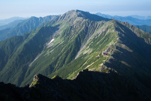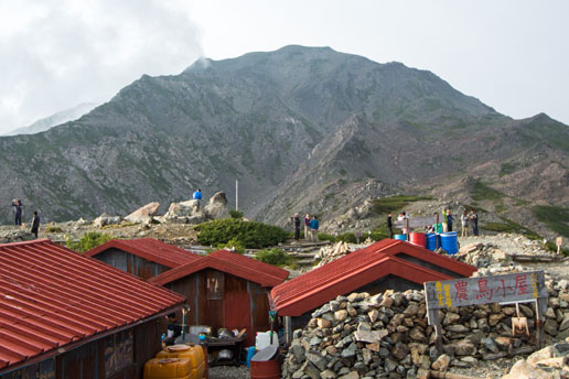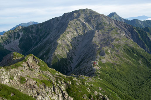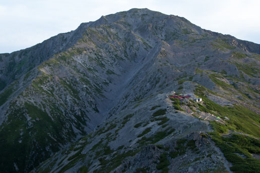 農鳥小屋まで下って見上げると、どっしりかまえた間ノ岳が小屋の背後に聳えています。