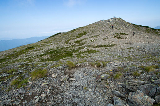 周辺にはたくさんの高峰があり、その山容から受けるイメージもあって、間ノ岳はあまり高くは感じません。