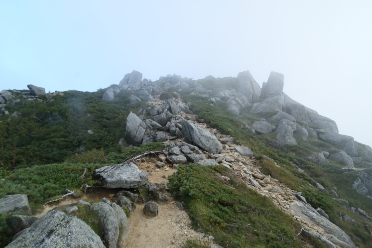 やっとのことで急登を終え、傾斜が緩やかになった。そろそろだなとホッとしたものの、歩いても歩いても山頂に着かない。おかしい。それに加えて、次から次へと岩がちな小ピークを越えなければならない。