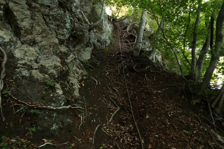 どう見ても先へ進めない。尾根に乗るしかない。尾根を見上げて斜面を観察する。50mくらい登れば尾根に乗れそうだ。下の方は傾斜がキツいが、上部は比較的ゆるやかに見える。行けそうだな。