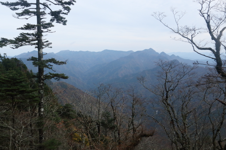標高を上げていき、樹林が途切れたところで振り向くと、稜線上の尖った山が目に入った。あれが山上ヶ岳かな。