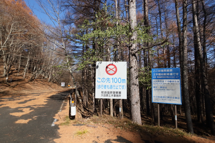 国道400号を少しもどって塩那道路へ入った。塩那道路というのは、塩原温泉と那須高原を結ぶ観光道路として計画されたものの、建設途中で放棄されて開通しなかった幻の山岳道路だ。ほとんどの区間は通行不能だが、通行止めゲートの手前が弥太郎山の登山口になる。