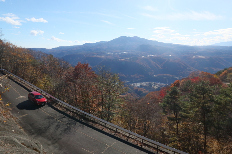 九十九折りの道を走って標高を上げていく。山岳地帯を貫く観光道路として計画されたのだから眺めが良いのは当然だ。秋晴れの一日で山の紅葉が一層美しい。