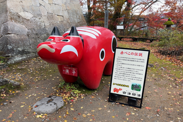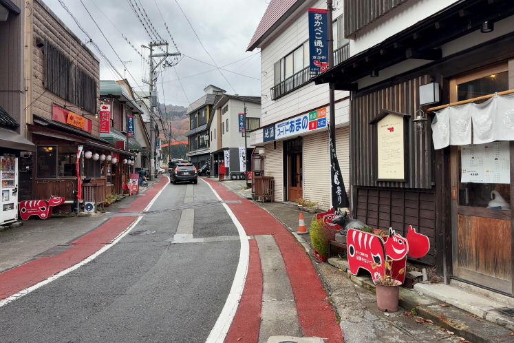 赤べこ推しなので、通りには赤べこのカットアウトが並ぶ。首が揺れる本物の赤べこを店頭に置いた土産物屋もあった。観光客もちらほら歩いている。
