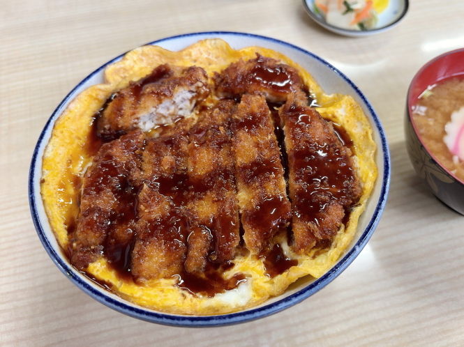 食べてみるとカツの下には卵がなかったので、おそらく小型のフライパンを熱してカツを置き、その周りに溶いた卵液を流して焼いたと思われる。これは、ソースカツ丼地域に卵とじカツ丼が誤って伝播したのだろうか。