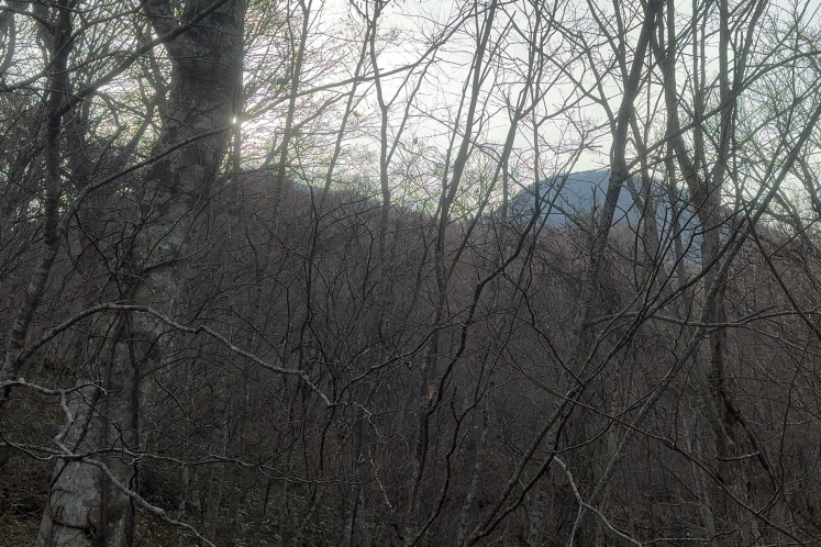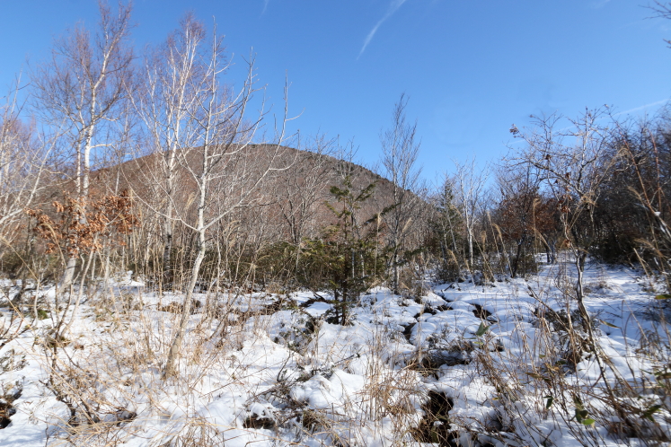 葉を落とした木々の向こうに見えるおっぱい型の双耳峰を眺めながら、林道を歩いて二岐温泉までもどった。