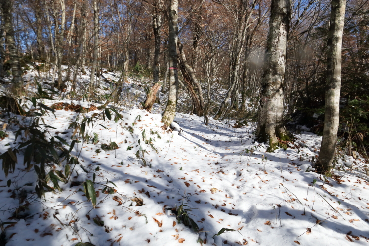 北側斜面は予報通り雪が深かった。鞍部には雪が溜まっている。もう靴の中に雪が入るとか考えていられない。