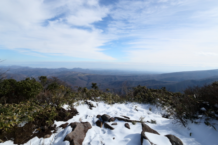 ひいひい喘ぎながら二岐山の山頂に到着した。360度ぐるりと見回せる開放的な山頂だ。見慣れない山ばかりなので、どれが何山なのかはさっぱりわからない。