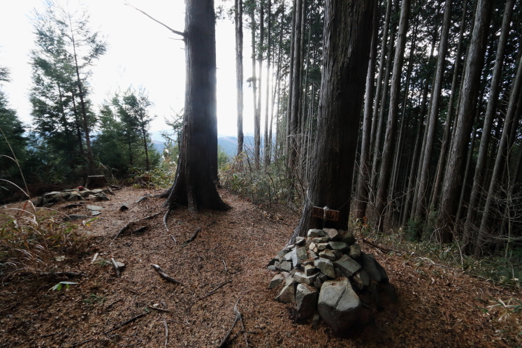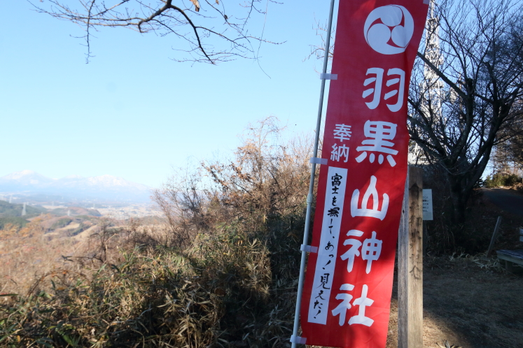 山頂の手前の開けた場所ではためく幟には、ここから富士山が見えるとあった。富士山どこだろうと目を凝らすと、山並みの向こうに端正な富士の頂を見つけた。