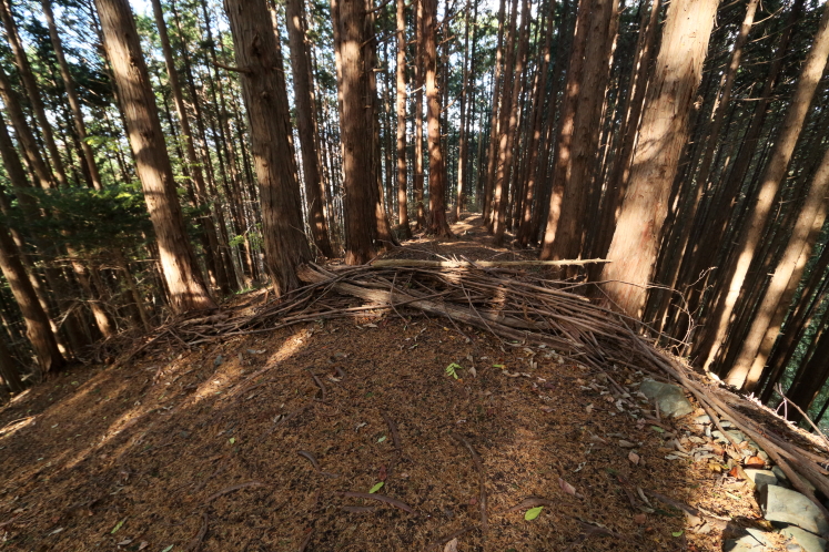 神社の裏手へ周り、斜面をジグザグに登っていく。折り返し地点には、その先へ行ってしまわないように棒が置いてあるのだが、普通は一本か二本のところ、小さな壁のように棒を積み上げてある。それも全ての折り返し地点にだ。