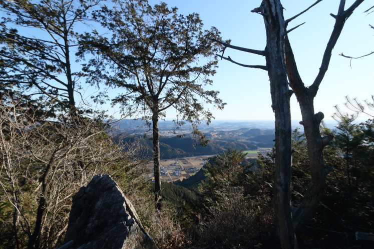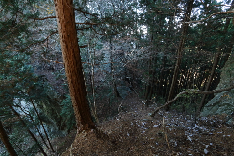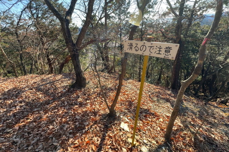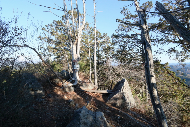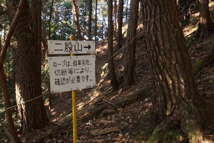 二股山は、その名が示す通りの双耳峰だ。南峰に登頂して股の部分へ降りると、キレットの表示があった。標高568mの山でキレットもないだろと思うものの、山の険しさは標高と比例はしないし、いちおう切れ落ちてるのだから切戸には違いない。