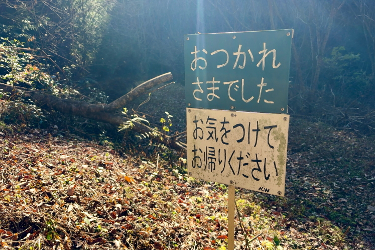 北峰から北側の登山道を歩いて周回で下山した。下山地点でも手作り看板が労ってくれた。