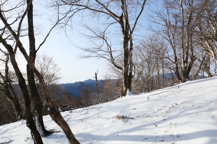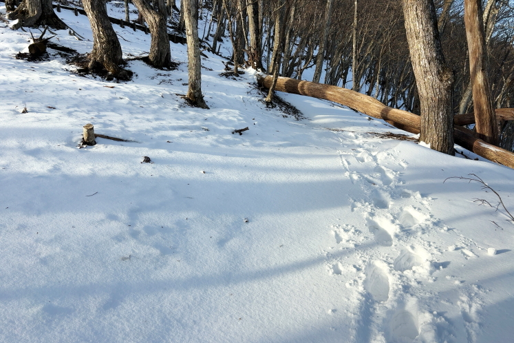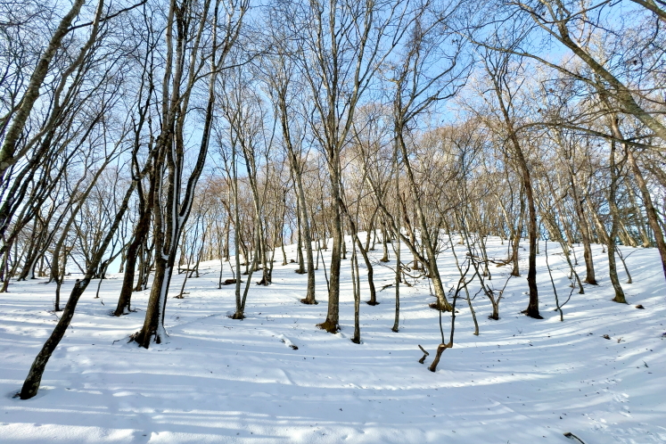 ふかふかした新雪を踏みしめ踏みしめ登っていく。急な斜面は、やわらかな雪に埋もれるようにして登る。ふわふわ浮いているようで楽しい。これがパウダースノー登山の魅力だ。