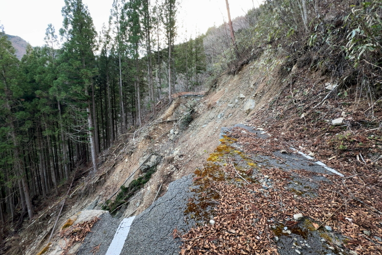 山道を走り標高を上げていく。上へ上へと登るにつれて、路面に落ち葉や枯れ枝が散乱し始めた。なんだかあまり車が通行してない雰囲気だなと思っていたら、突然道が消えた。なんということでしょう、道路が大規模に崩落しているではないですか。