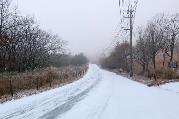 登山口に向かうにつれて、なんだか雲行きが怪しくなってきた。早朝は晴れ間も見えていたのに、いつの間にか灰色の雲が垂れ込めている。辺りは薄暗くなり、あろうことか雪が降り出した。