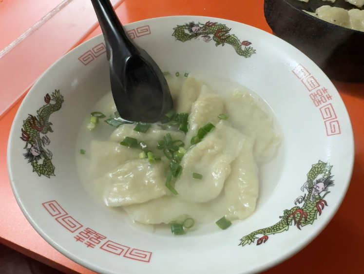 昨年は焼き餃子をお代わりするのに夢中で食べなかった水餃子も今回は注文した。店員さんの勧める通りに、スープにタレを加えて食べる。焼き餃子のパリッと感や油っぽさは当然ながら無く、さっぱり食べられる。焼き餃子をお代わりする合間に食べるのにちょうどいい。