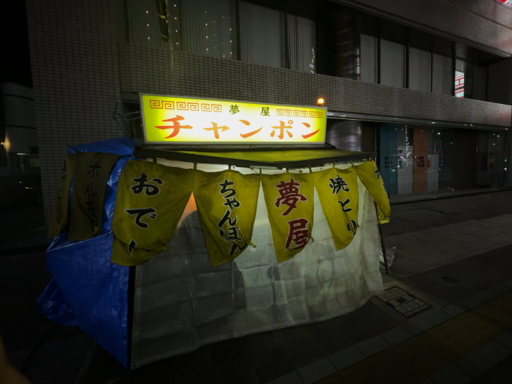 暗闇にポツリと屋台の看板が点灯していた。お客さんも入っている。夢屋というのが屋号なのだろう。チャンポンを売りにしてるようだ。若干の入りにくさを感じつつ、酔った勢いでビニールシートをかき分けて入った。
