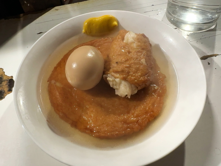 おでん種に餃子巻きがあったので早速注文した。ずっと食べてみたいと思っていたが、なかなか出会う機会がなくて食べられずにいたおでん種だ。他は九州らしく丸天と、卵もお願いした。