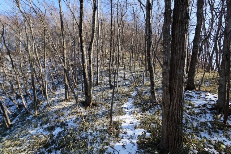 標高が上がると残雪があった。思ったよりも深い。靴が防水ではないので、雪にハマると足が濡れてしまう。残雪が深いのは日の当たらない北側のトラバース路だけだから、そんなに長くはないはずだ。このまま進んで大丈夫だろう。