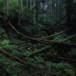 集落を抜けて山に向かって歩いていくと、すぐに道は荒れた林道になった。